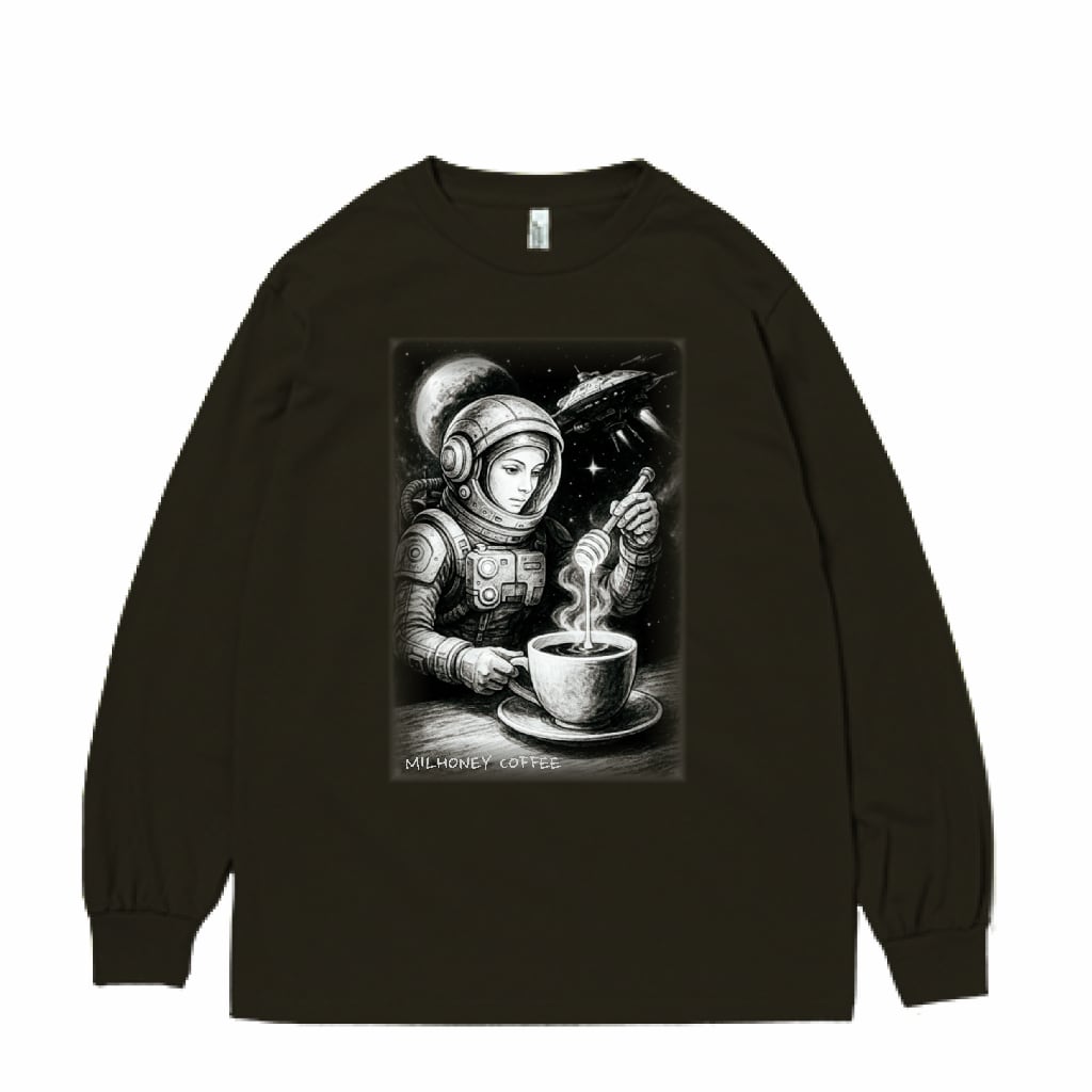 「宇宙という無限の静寂と深さの中で、ただ一杯のコーヒーが心を満たす」―そんな世界観を表現しています。USコットンを100%使用したアメリカンな質感のロングスリーブTシャツです。
